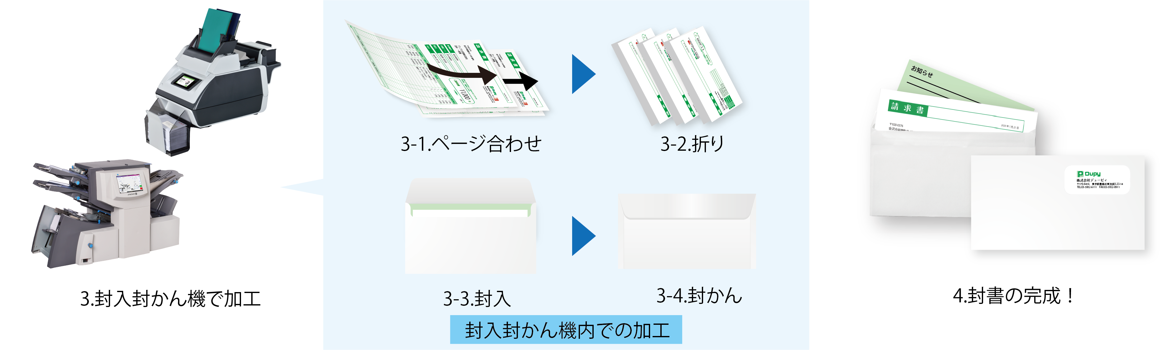 折り、封筒への封入、封筒の封かんを自動で行います。