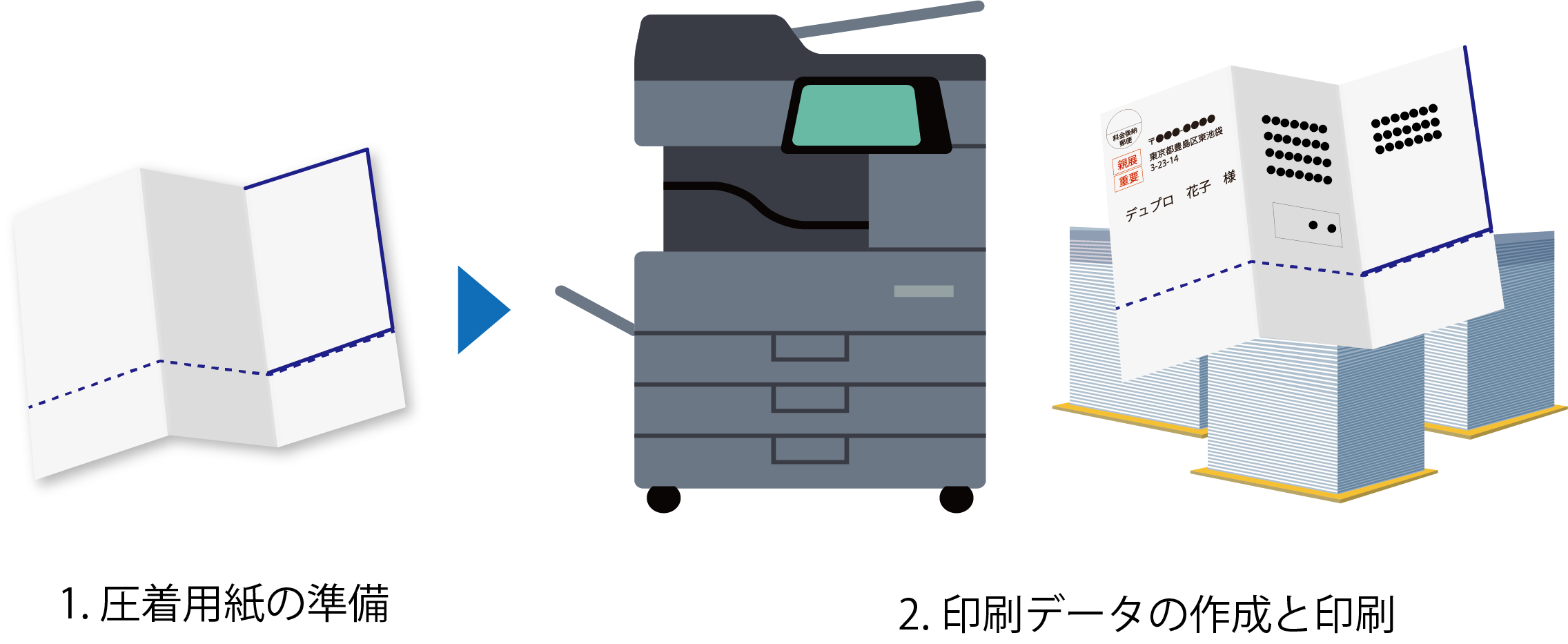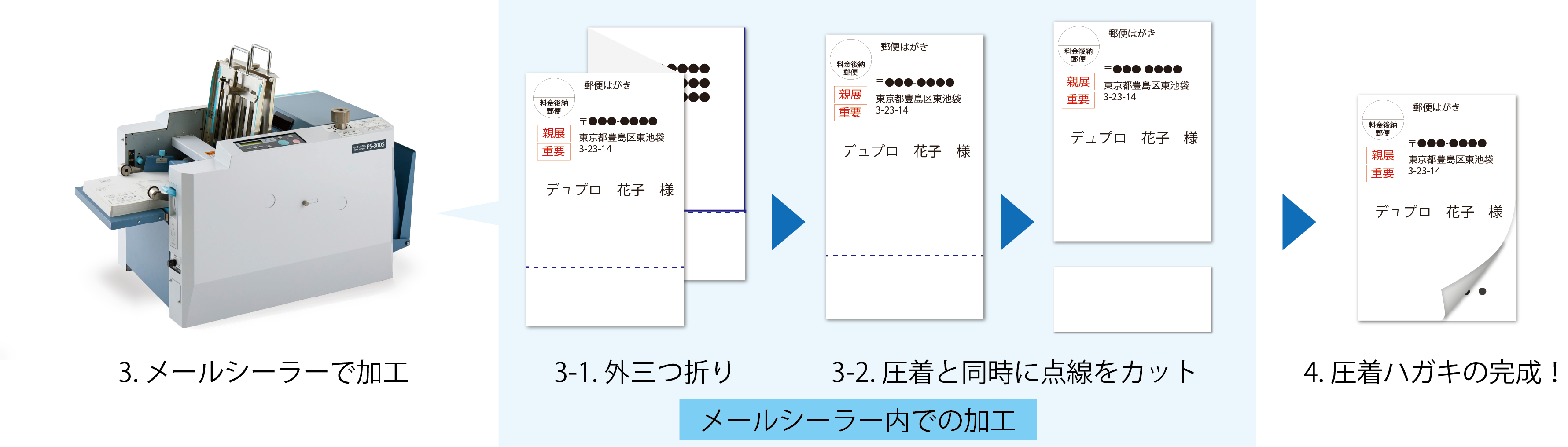 サイズや折り仕様(V折り・三つ折りなど)など用途に合わせて、圧着用紙を選択します。