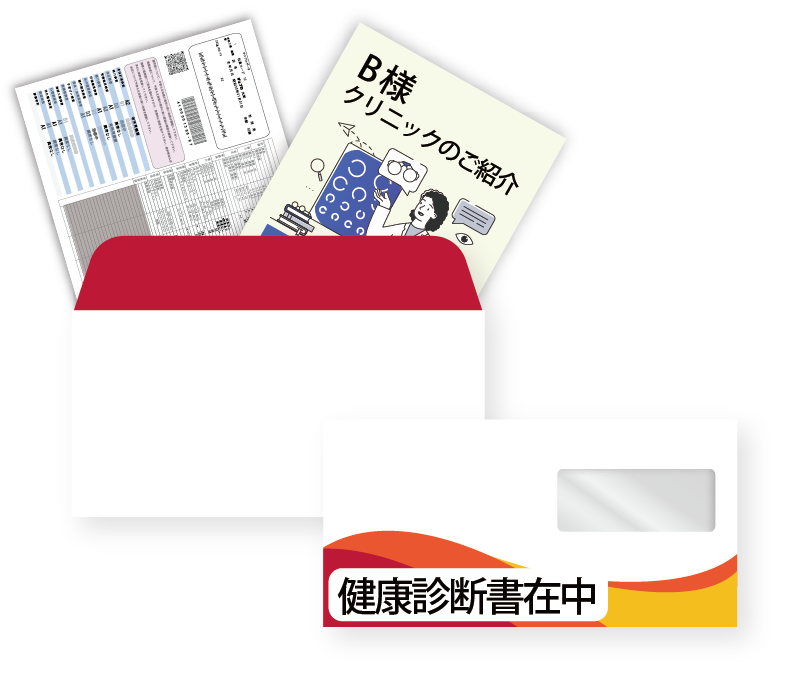 医療機関 健診結果通知+案内チラシ生活習慣改善、食生活改善、乳がん検診、 ストレスチェックアンケート