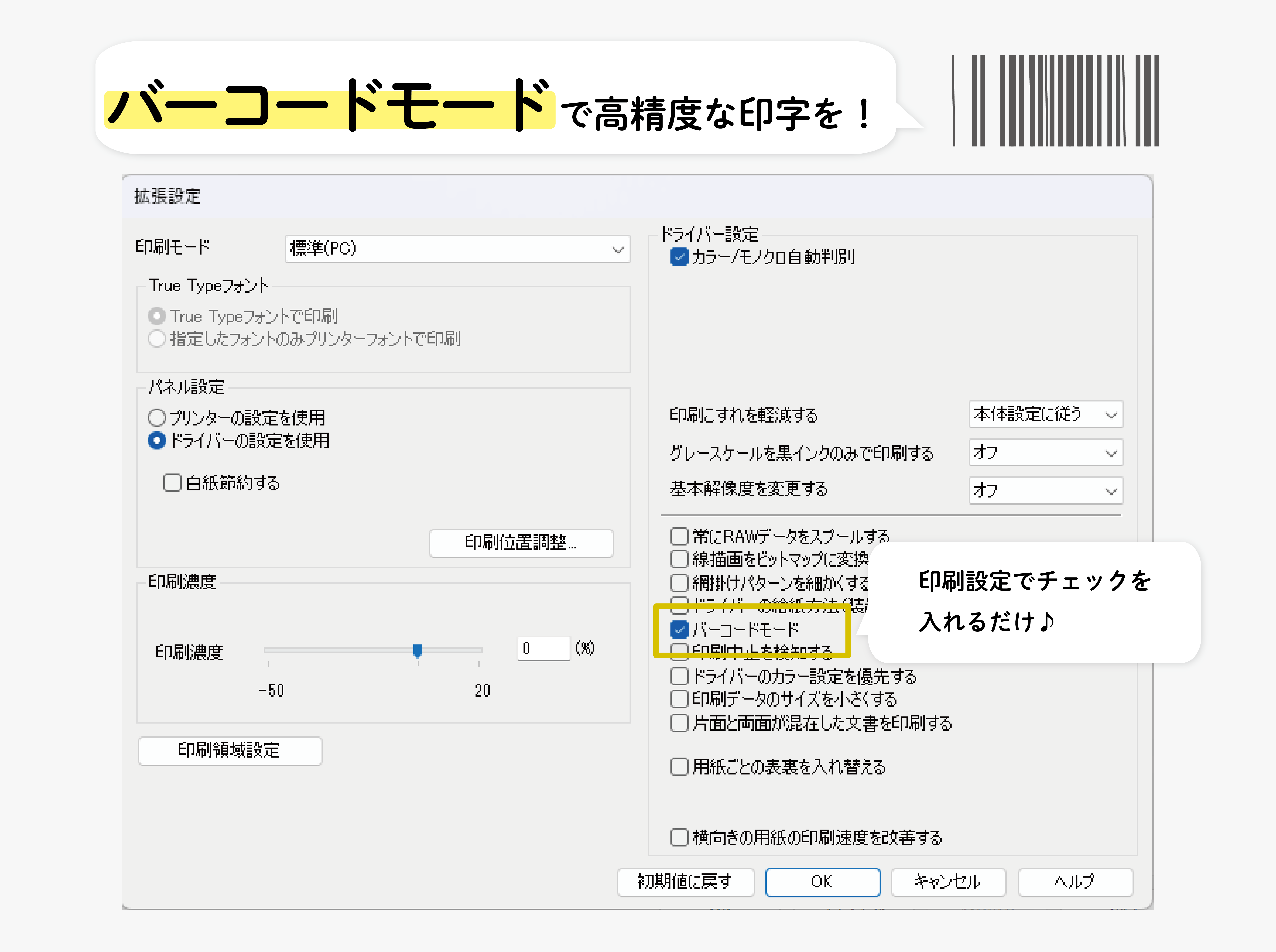 「バーコードモード」をプリンターの設定で指定すれば、精細なバーコードの印刷ができます。