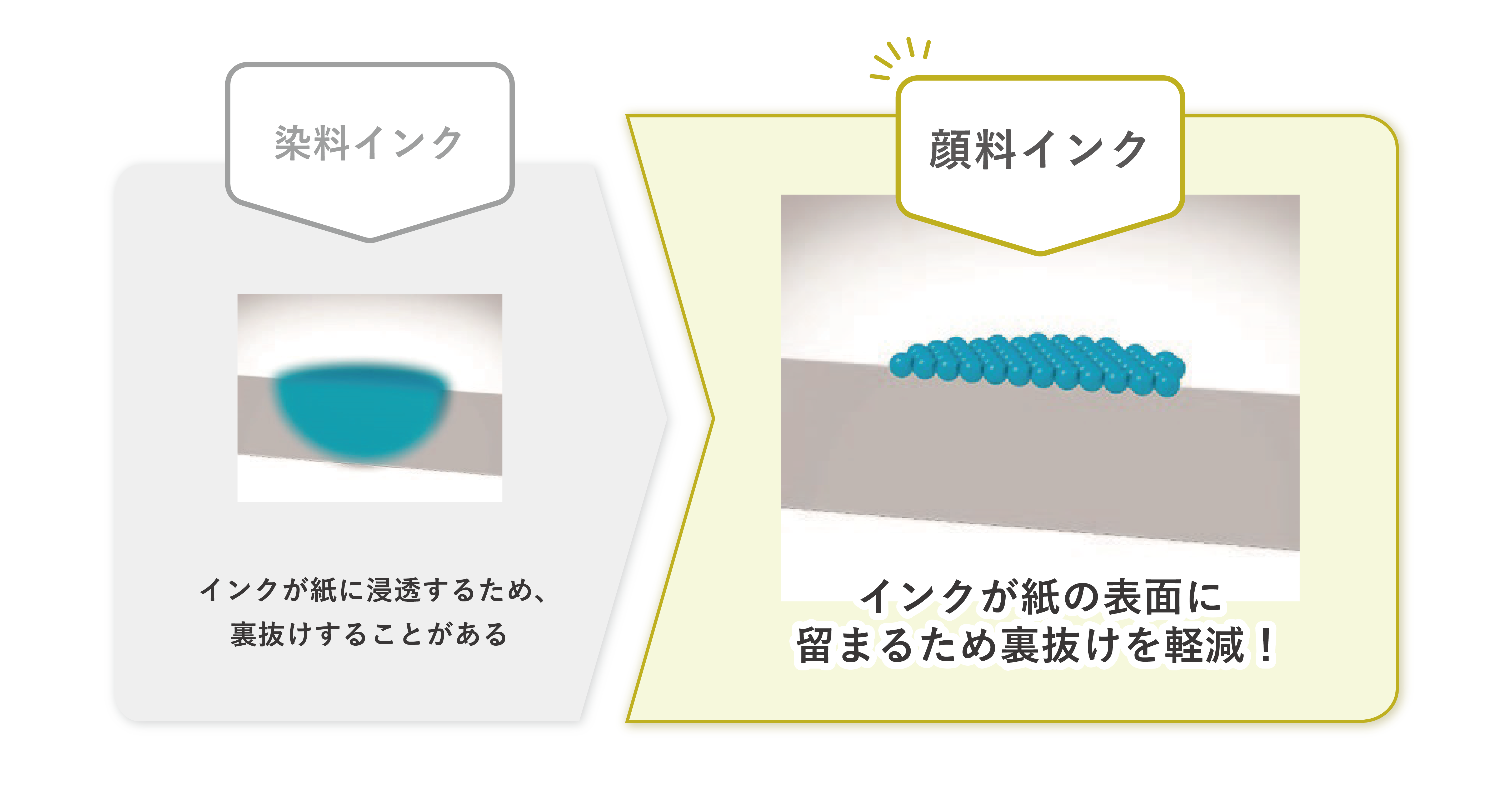 〈LX〉〈LM〉シリーズに用いている顔料インクは用紙の表面に色材がとどまるため、