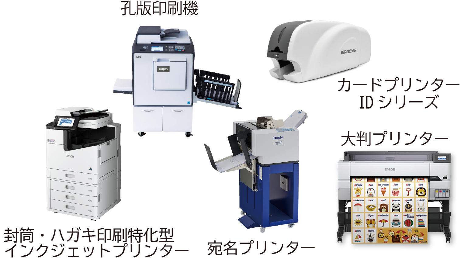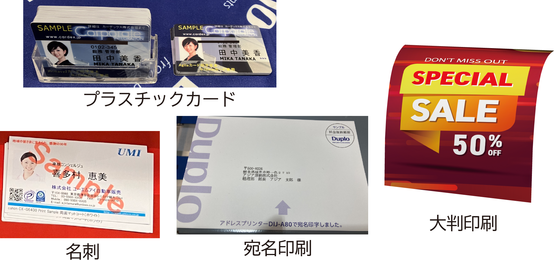 封筒・ハガキ・名刺・プラスチックカードなど、様々な媒体への印刷に対応しています。