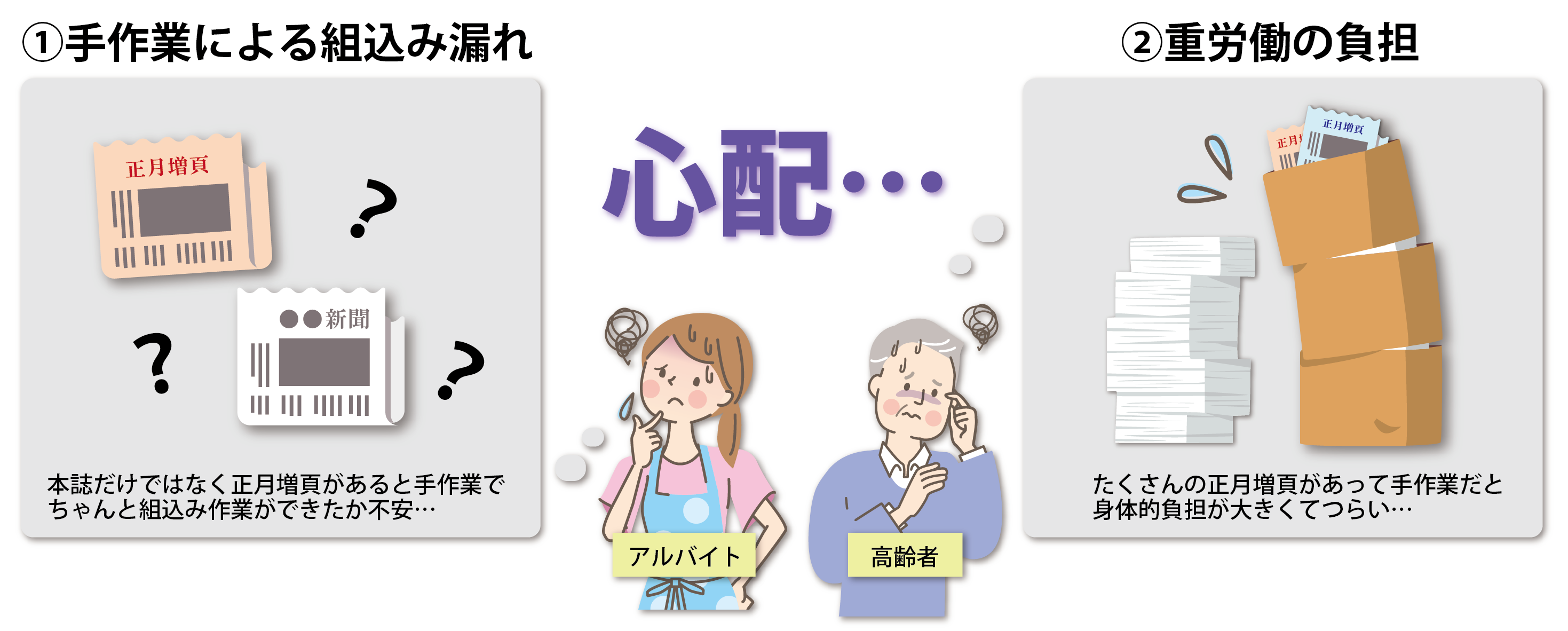 正月の増頁や、特別号外などの組込み作業を機械化することで、