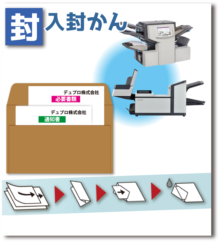 ページ合わせ→紙折り→封筒入れ→封かんを全て自動化。