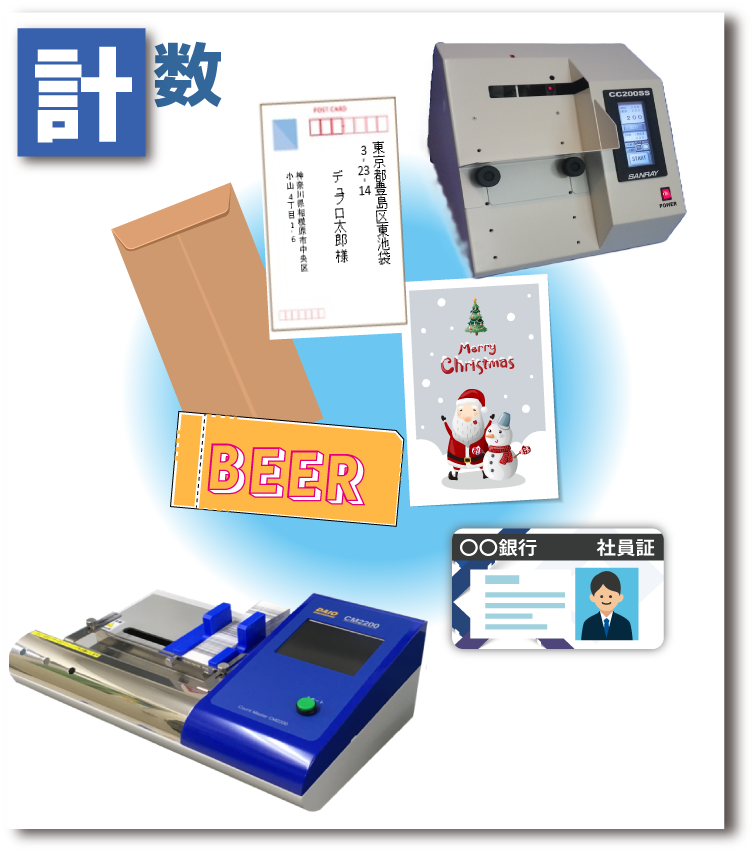 ハガキ・封筒はもちろん商品券やカードの計数も可能なので、