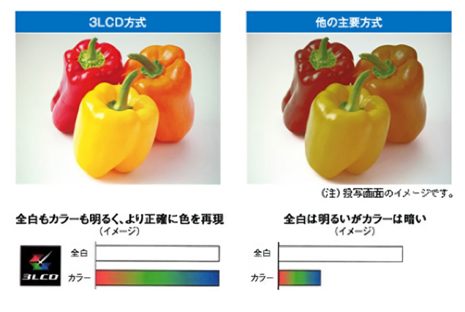 3LCD方式は、白とカラーの明るさが同じ。