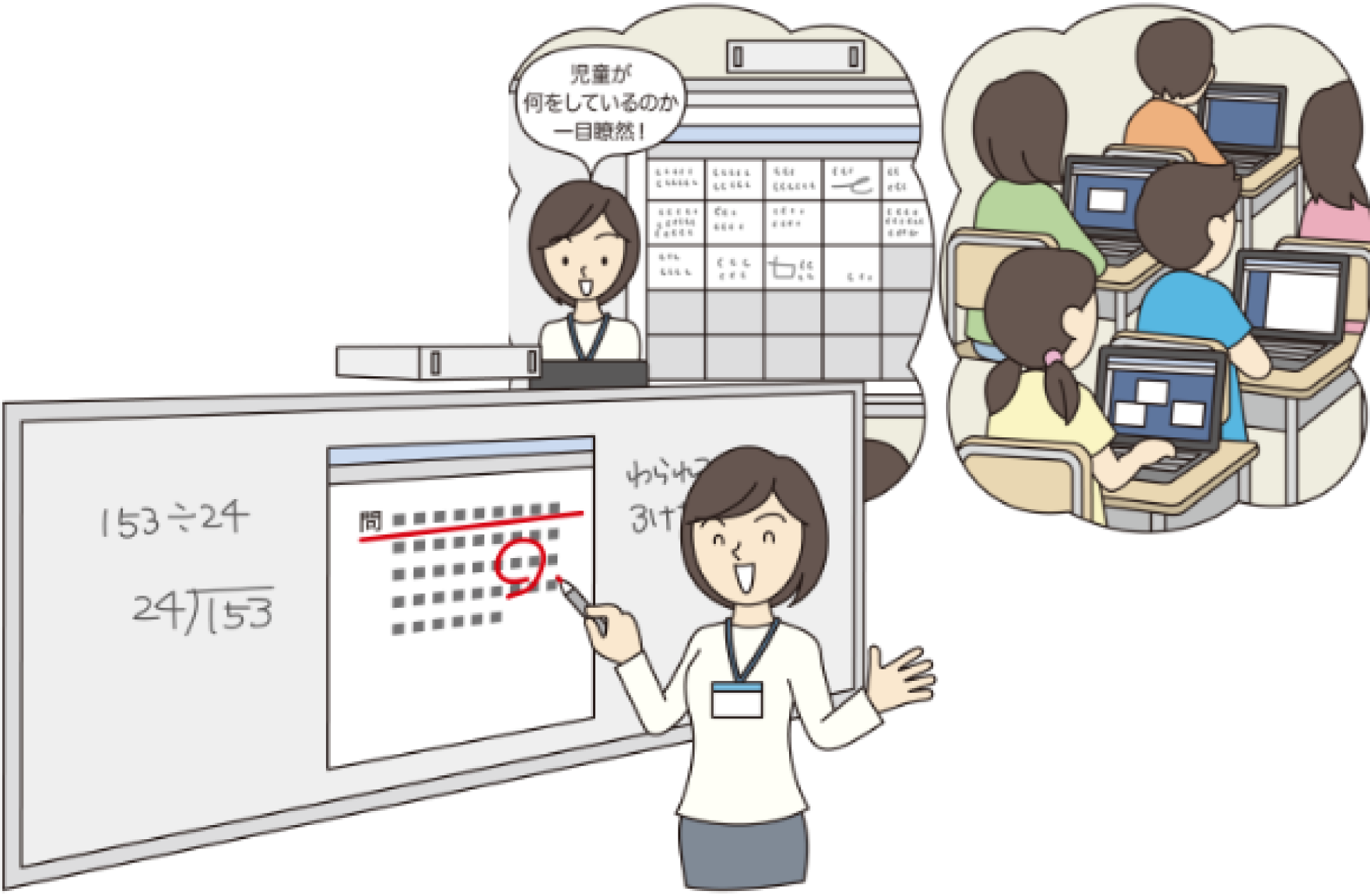 いつもの板書と、教材、生徒一人一人の端末画面、先生の端末画面、