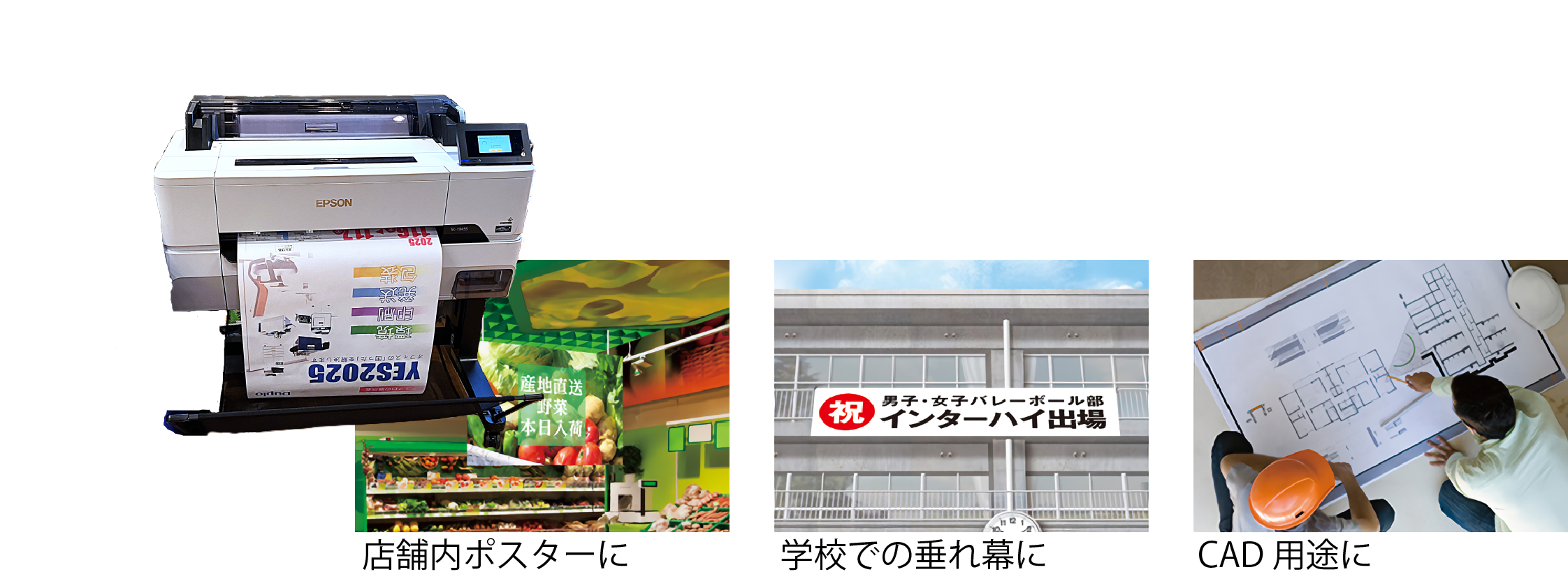 大容量ロール紙でのコストカットや入れ替えの手間削減、電飾用フィルムでの新たな販促物作成が可能です。