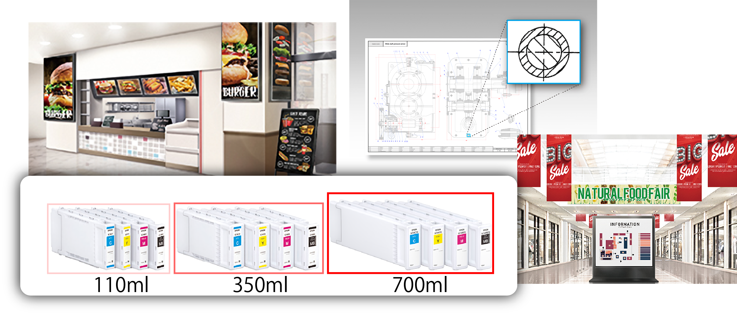 大容量ロール紙でのコストカットや入れ替えの手間削減、電飾用フィルムでの新たな販促物作成が可能です。