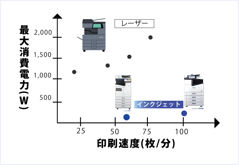 熱を使用しないインクジェットプリンターは、スピードが速くなっても低消費電力。